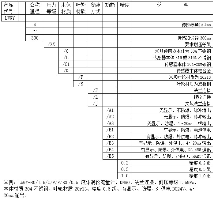 LWGY型液體渦輪流量計是一種速度式流量測量儀表。用于測量充滿于封閉管道中連續(xù)流過、較低粘度的清潔液體體積流量。流量計可輸出對應通過流量計的體積瞬時流量、累計流量的電信號,供自動化系統(tǒng)使用。